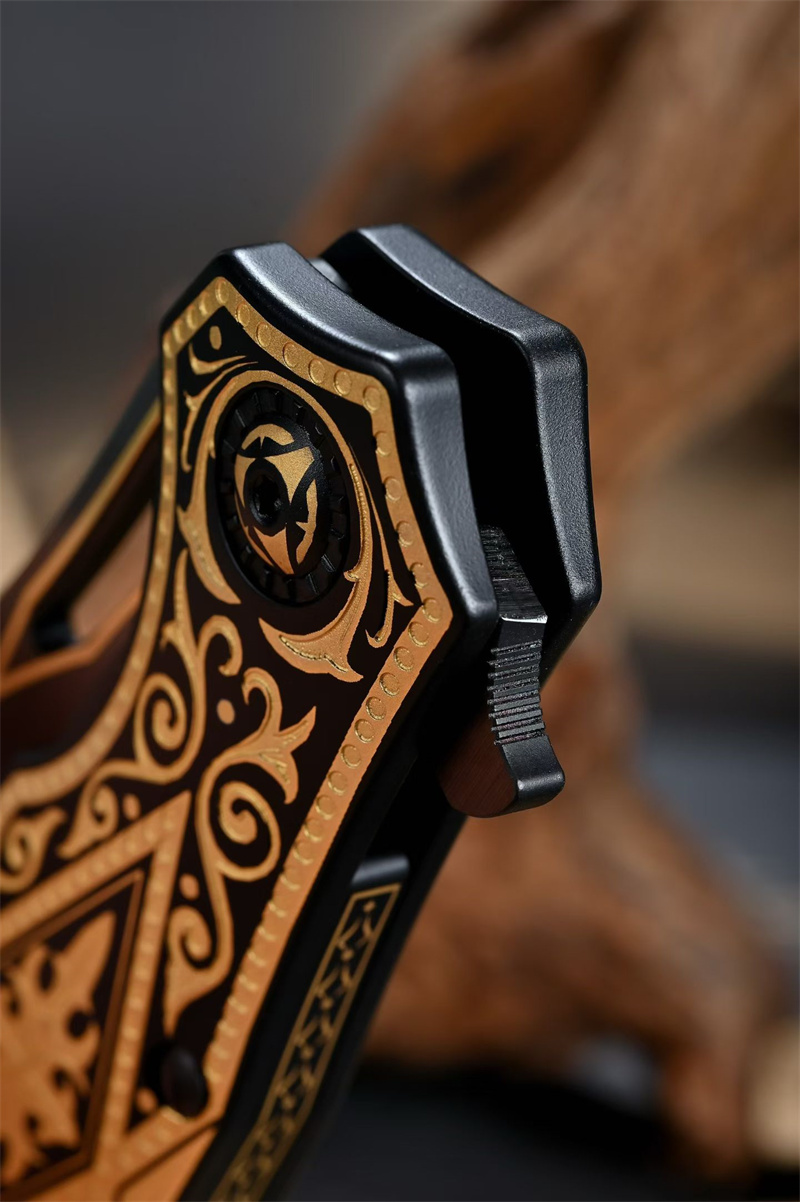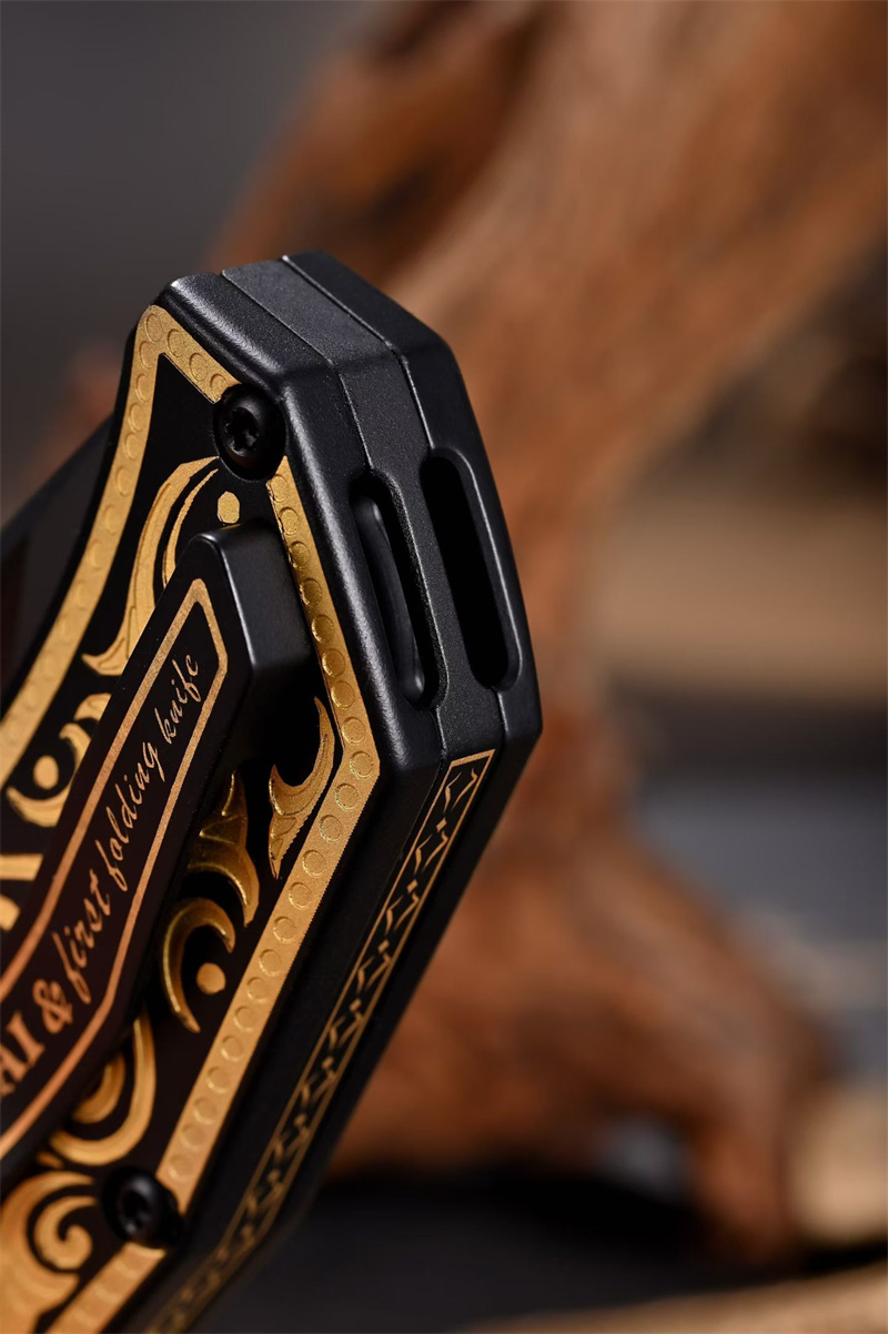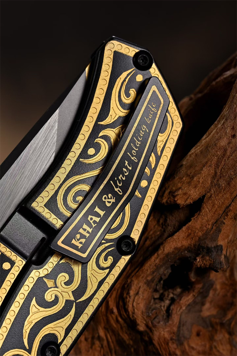 采用了廓尔喀样式的刀身,线条凌厉优雅。刀身为CPM-3V钢材制作,刀身结构坚固,厚度达到了3.8毫米,硬度为60-61HRC。刀身表面采用了DLC黑色涂层处理,同时使用鎏金工艺制作了刃纹。刀身后部开有开刀孔,四周也采用了鎏金包边处理。刀刃根部设计了快开鳍,除了开刀更为迅猛外,还兼具有护手的作用。刀柄为钛合金制作,表面黑色部分为陶瓷涂层,人体工程学设计,握持舒适稳固。KHAI为刀柄设计了手工雕花鎏金纹饰,设计灵感来自于西班牙王室的纹章。因为钛合金和空气接触后会形成氧化膜,所以对其他金属有着排异反应,因此钛合金的鎏金还是比较困难的。KHAI为了解决这个问题,特意请教了一些金属专家,操作方法是先鎏一层铂金,然后在铂金上面再鎏一层相当厚的24K黄金,最终达到了黑与金的极致和谐。如王室徽章般的华丽刀柄,让折刀更像是一首夜色中的金色乐章。实木核桃木盒收纳。木盒带有展示功能,正面安装了玻璃。随刀赠送了KHAI经典的品牌介绍卡、产品参数卡,还有KHAI为折刀新开发的纪念牌,采用了DLC镜面工艺,带有LOGO和产品介绍。
