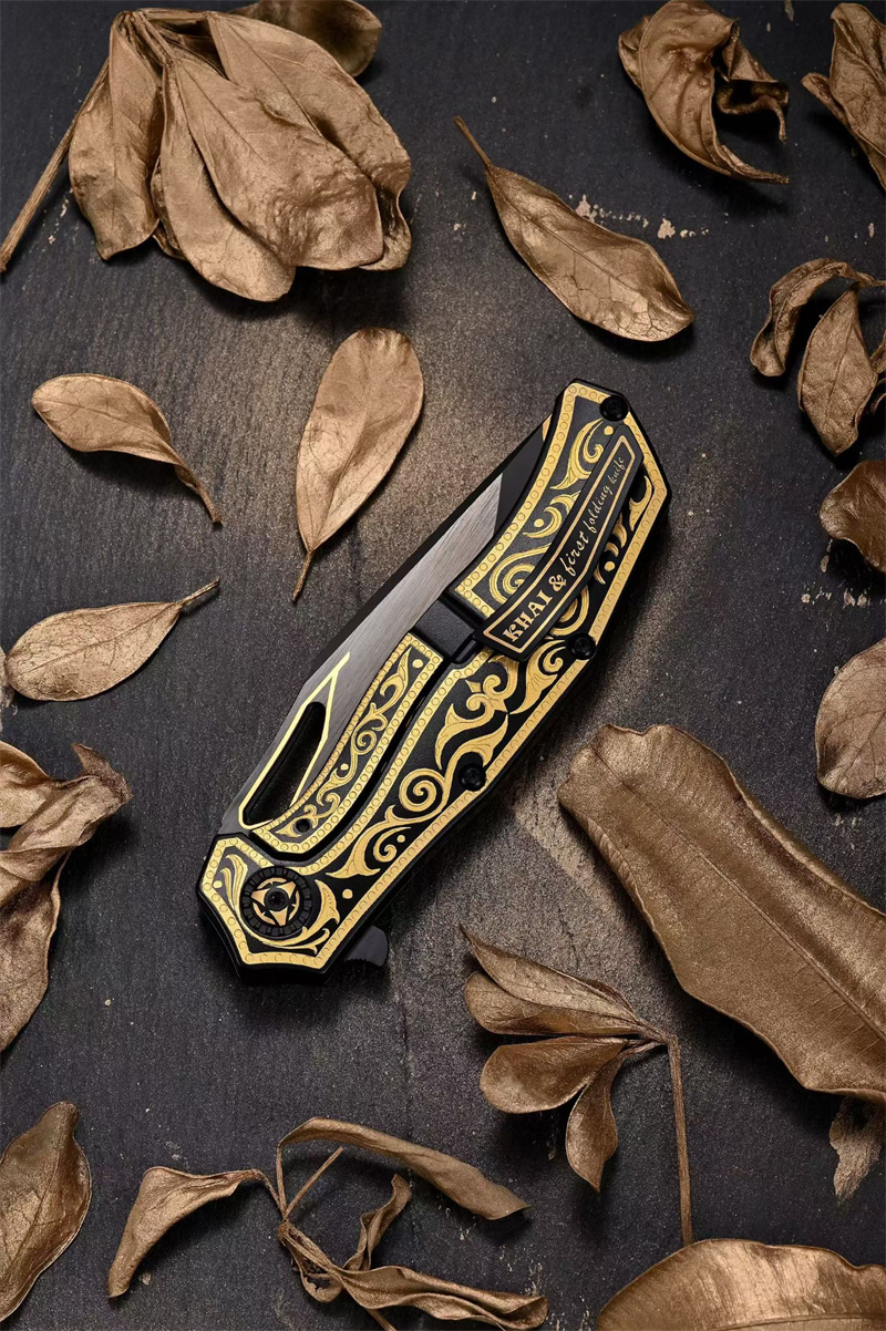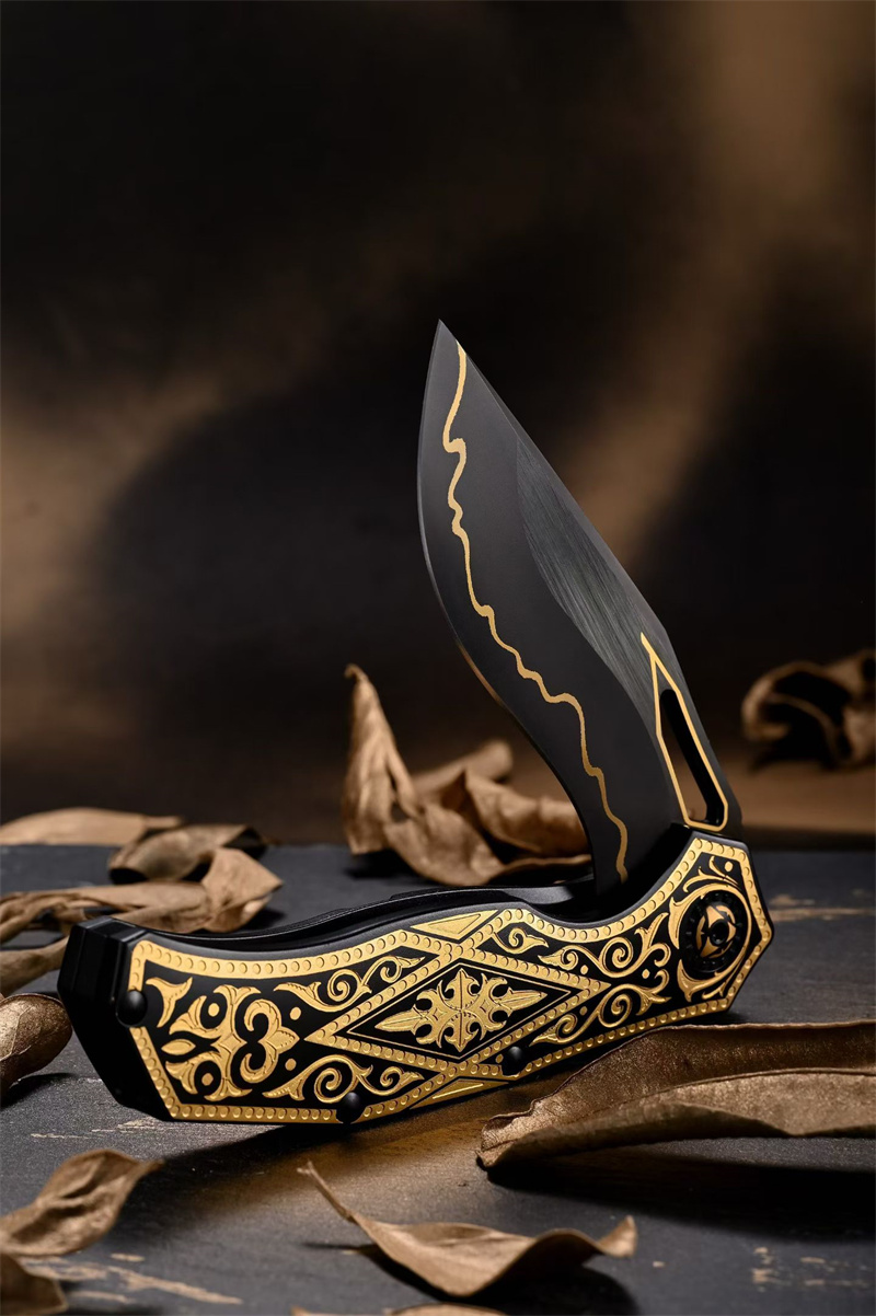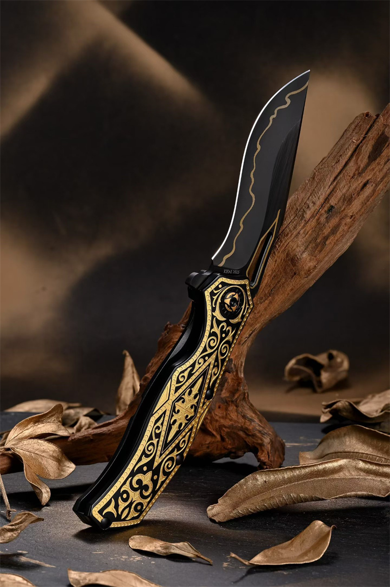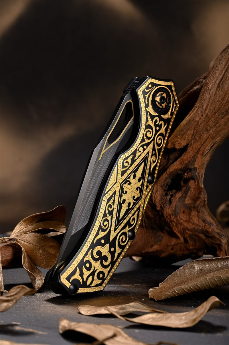 采用了廓尔喀样式的刀身,线条凌厉优雅。刀身为CPM-3V钢材制作,刀身结构坚固,厚度达到了3.8毫米,硬度为60-61HRC。刀身表面采用了DLC黑色涂层处理,同时使用鎏金工艺制作了刃纹。刀身后部开有开刀孔,四周也采用了鎏金包边处理。刀刃根部设计了快开鳍,除了开刀更为迅猛外,还兼具有护手的作用。刀柄为钛合金制作,表面黑色部分为陶瓷涂层,人体工程学设计,握持舒适稳固。KHAI为刀柄设计了手工雕花鎏金纹饰,设计灵感来自于西班牙王室的纹章。因为钛合金和空气接触后会形成氧化膜,所以对其他金属有着排异反应,因此钛合金的鎏金还是比较困难的。KHAI为了解决这个问题,特意请教了一些金属专家,操作方法是先鎏一层铂金,然后在铂金上面再鎏一层相当厚的24K黄金,最终达到了黑与金的极致和谐。如王室徽章般的华丽刀柄,让折刀更像是一首夜色中的金色乐章。实木核桃木盒收纳。木盒带有展示功能,正面安装了玻璃。随刀赠送了KHAI经典的品牌介绍卡、产品参数卡,还有KHAI为折刀新开发的纪念牌,采用了DLC镜面工艺,带有LOGO和产品介绍。