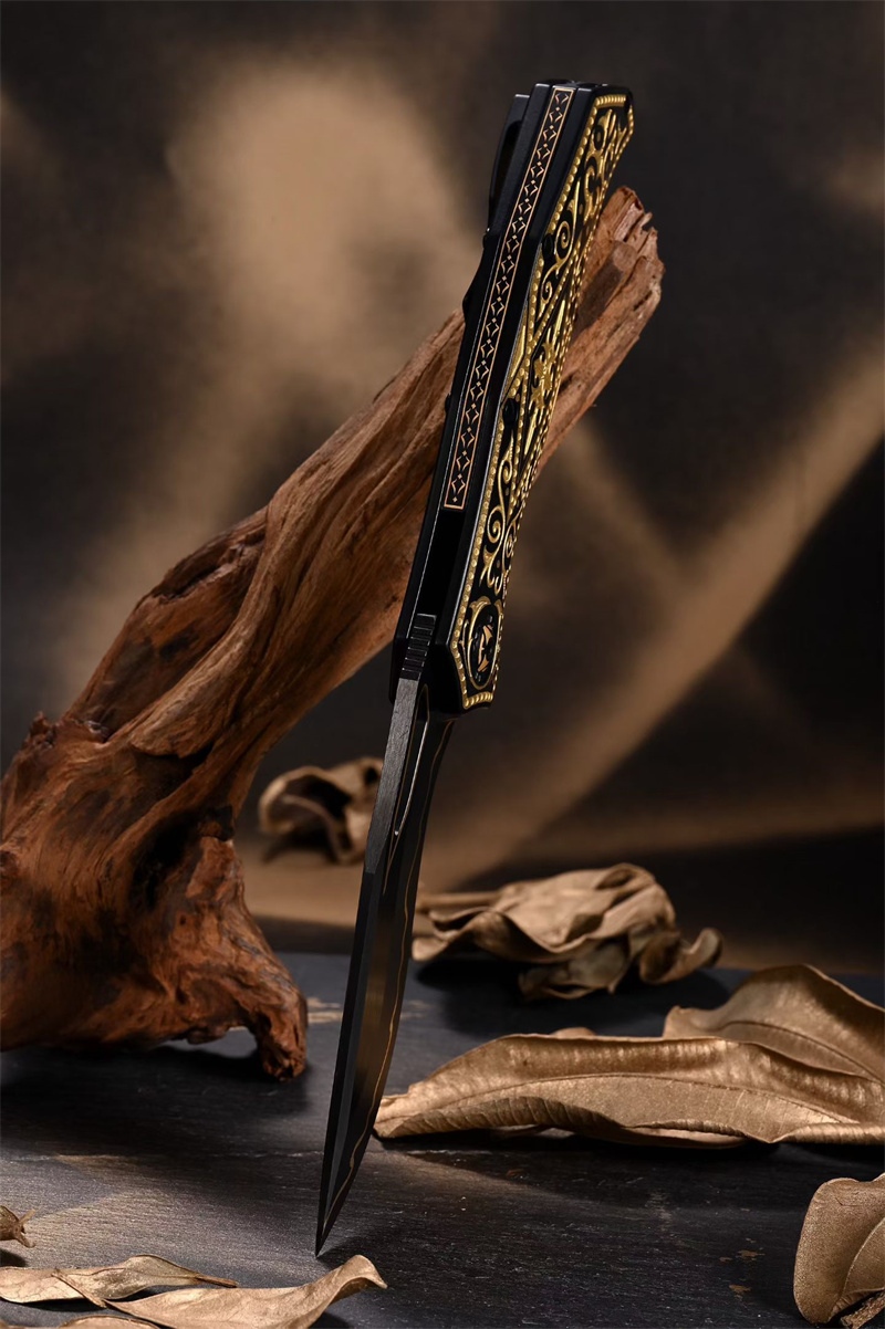 手柄钛合金表面处理黑色陶瓷涂层+鎏金雕花。。实木核桃木收藏礼盒。